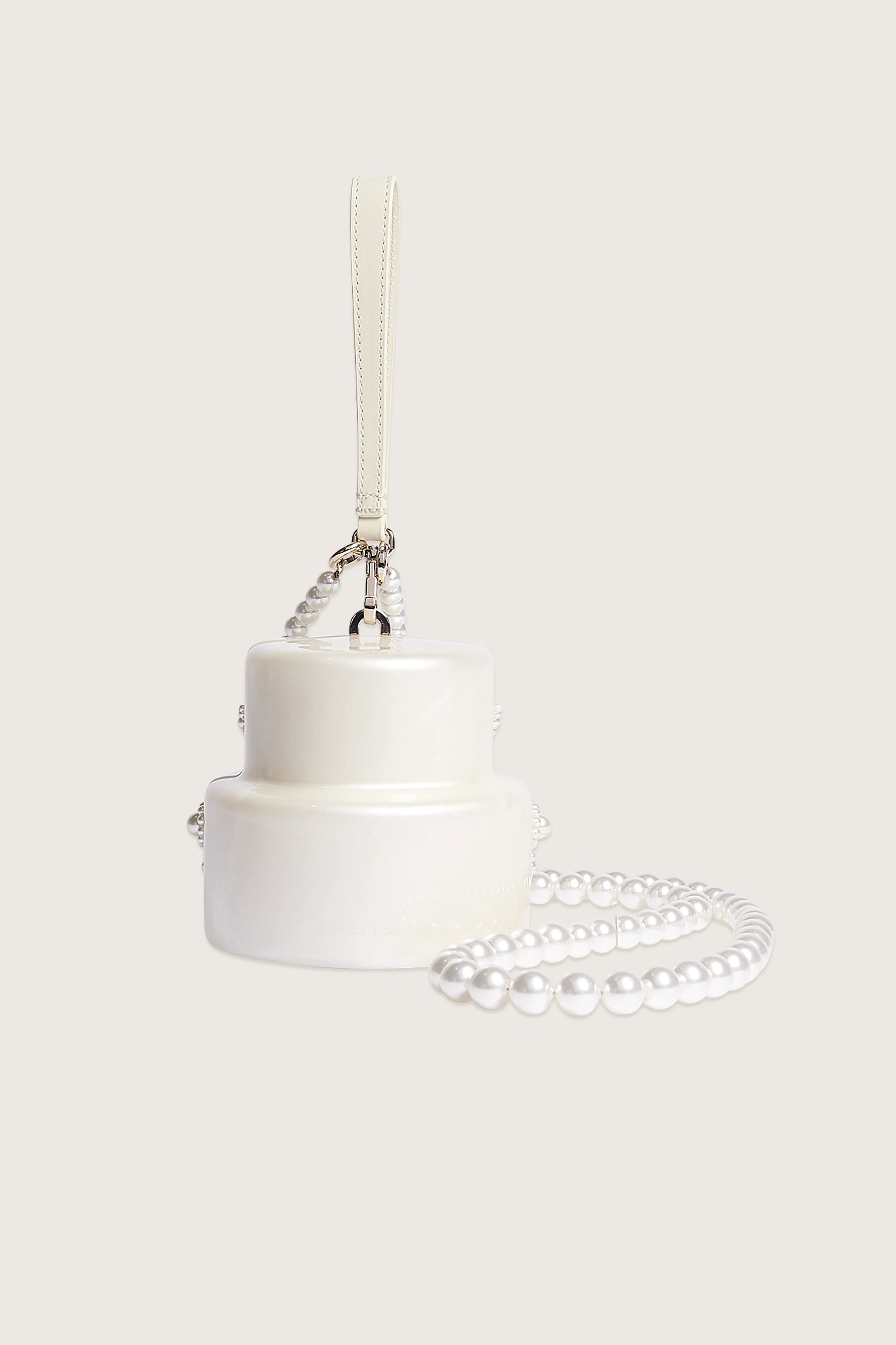 Pearl bag reimagined in the shape of a wedding cake. Perfectly finished with pearl embellishments throughout to mimic frosting. It features a pearl crossbody strap attached to a leather wristlet.